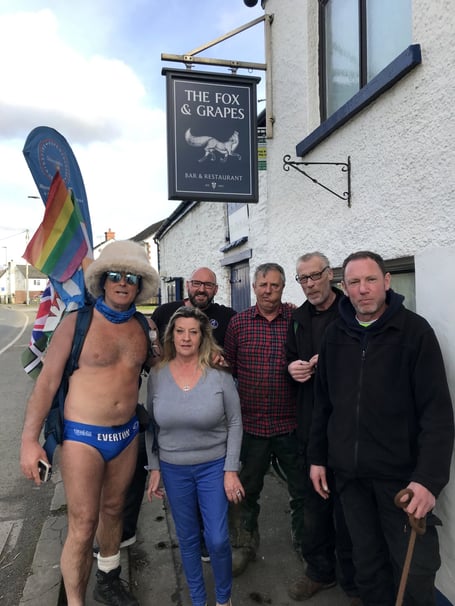 The man famous for raising hundreds of thousands of pounds by walking the length and breadth of Britain in just his Speedos has been given a hero’s welcome in West Devon as he stopped off en route during his latest challenge.