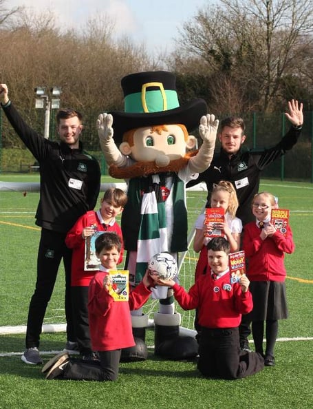 TALLAN?and Corey Burns are pictured with Plymouth?Argyle’s Pilgrim Pete and Okehampton Primary?School Year 4 children for their reading project.