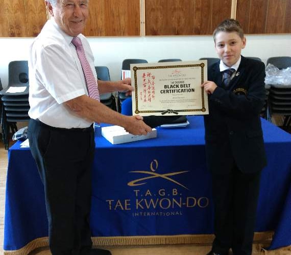 It was a nervous first experience for all of the white belts, including five from Okehampton, but they all passed and Ethan Voaden even gained a plus pass, which is far and above average standard. It was an inspiration to them to see their class helper Fred Sivyer be presented with his first dan certificates by grading examiner grandmaster Dew, who himself was promoted to ninth dan at the blackbelt grading in April this year. – ninth Dan is the highest grade in most styles of Tae Kwon Do and it takes a minimum of 45 years training to attain.